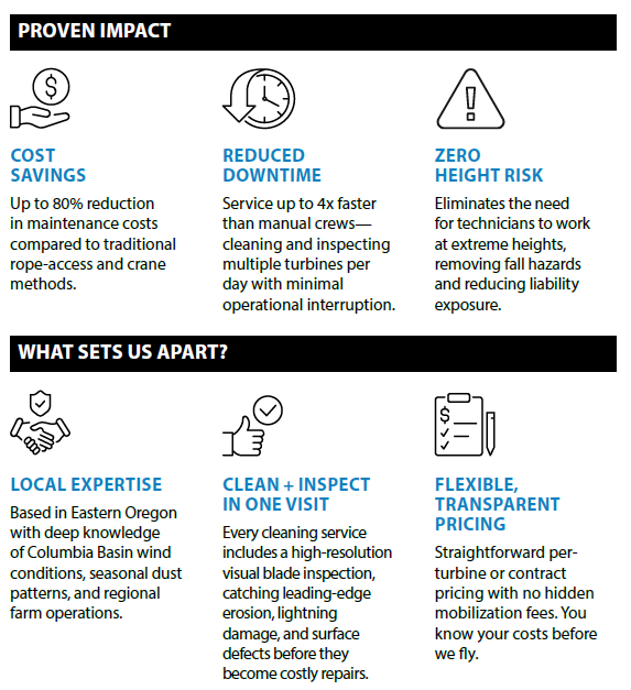 Keeping your wind farm performing at its peak—without putting crews at height. Columbia Maintenance Service uses advanced drone technology to clean and inspect wind turbine blades, towers, and nacelles across Eastern Oregon and the Columbia Basin.
